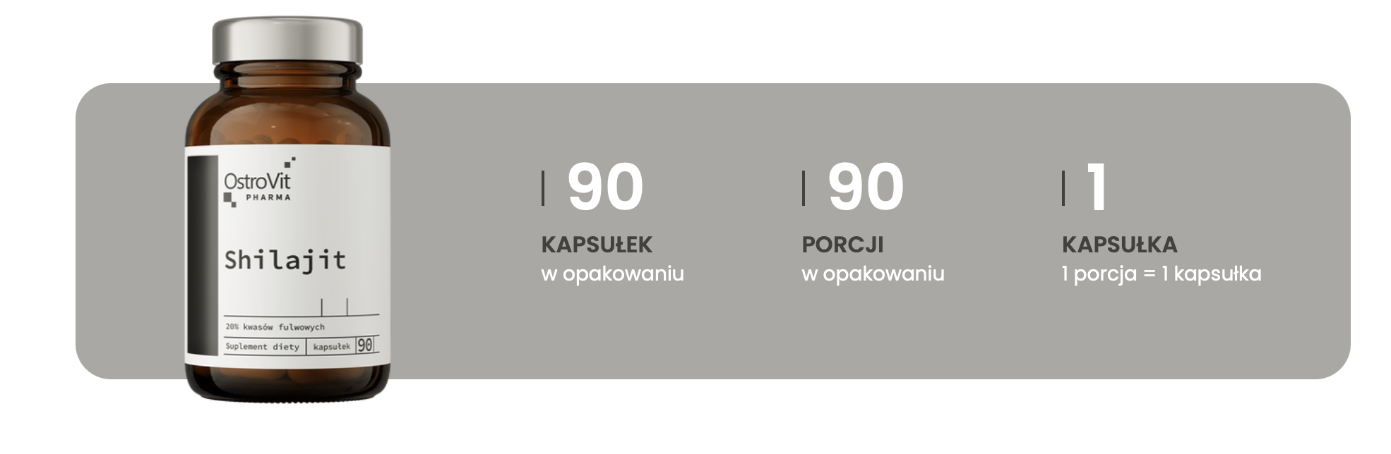 Składniki:  Ekstrakt z Shilajit (Asphaltum panjabinum) standaryzowany na 20% kwasów fulwowych, substancja wypełniająca: hydroksypropylometyloceluloza; inulina, substancja przeciwzbrylająca: sole magnezowe kwasów tłuszczowych.