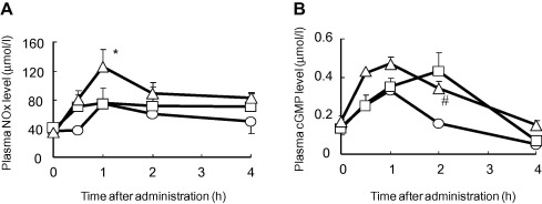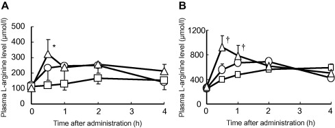 Wykres A przedstawia zmianę poziomów argininy u królików a wykres B u szczurów. Na wykresie zaznaczenie (□) to suplementacja samą cytruliną, (○) samą argininą a (△) połączeniem cytruliny i argininy (w połowie porcji).